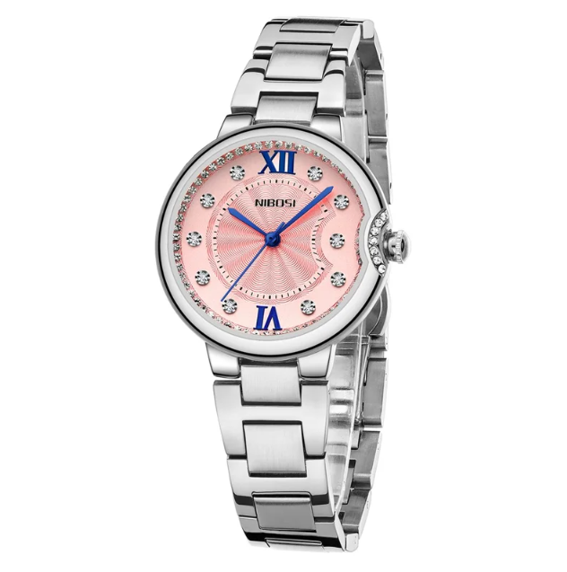 NIBOSI 3005 women's quartz watch | rhinestone decor | stainless steel strap white dial watch